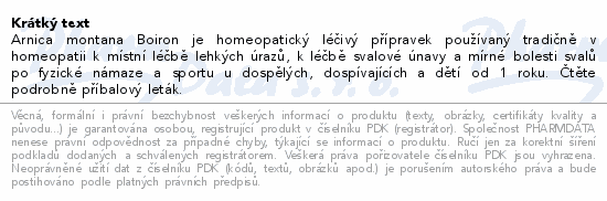 Arnica montana Boiron je homeopatický léčivý přípravek používaný tradičně v homeopatii k místní léčbě lehkých úrazů, k léčbě svalové únavy a mírné bolesti svalů po fyzické námaze a sportu u dospělých, dospívajících a dětí od 1 roku. Čtěte pozorně příbalový leták.