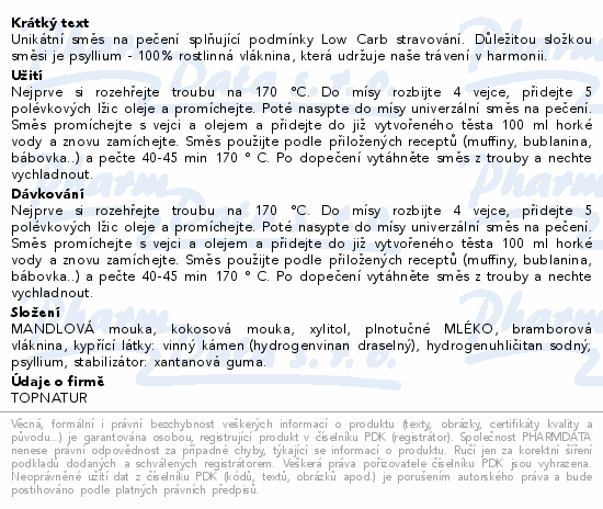 Unikátní směs na pečení splňující podmínky Low Carb stravování. Důležitou složkou směsi je psyllium - 100% rostlinná vláknina, která udržuje naše trávení v harmonii.