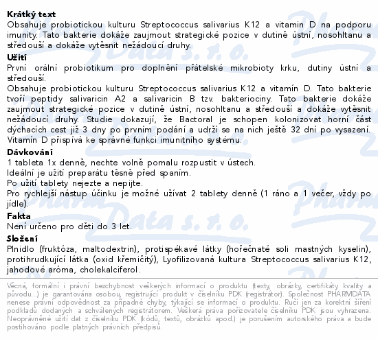 Obsahuje probiotickou kulturu Streptococcus salivarius K12 a vitamin D na podporu imunity. Tato bakterie dokáže zaujmout strategické pozice v dutině ústní, nosohltanu a středouší a dokáže vytěsnit nežádoucí druhy.