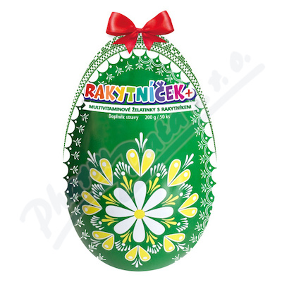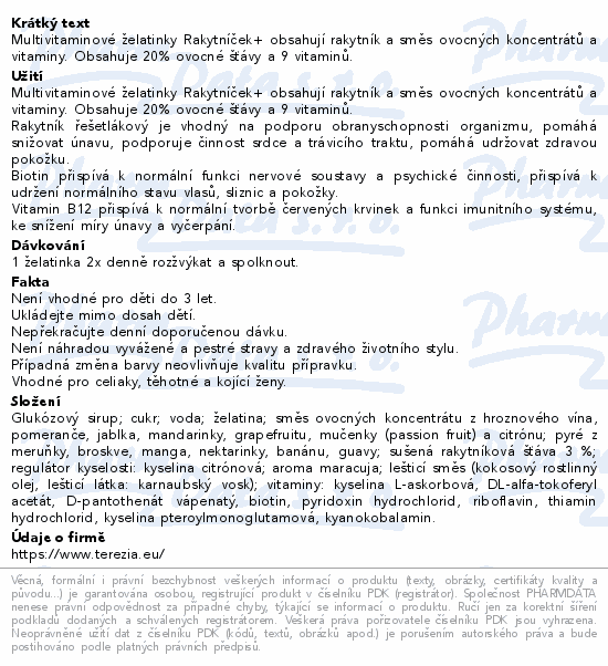 Multivitaminové želatinky Rakytníček+ obsahují rakytník a směs ovocných koncentrátů a vitaminy. Obsahuje 20% ovocné šťávy a 9 vitaminů.