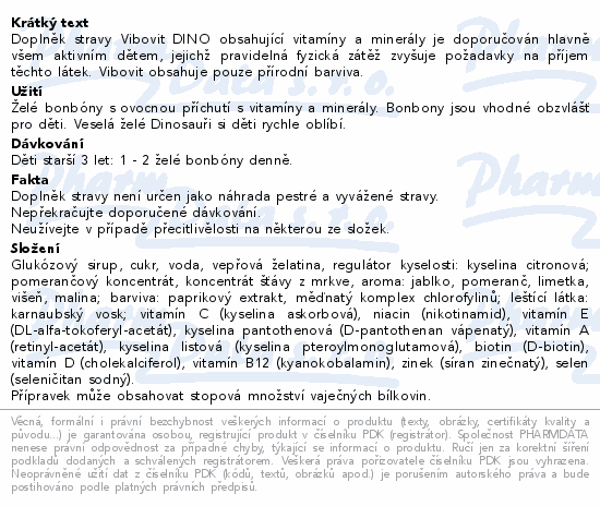 Doplněk stravy Vibovit DINO obsahující vitamíny a minerály je doporučován hlavně všem aktivním dětem, jejichž pravidelná fyzická zátěž zvyšuje požadavky na příjem těchto látek. Vibovit obsahuje pouze přírodní barviva.