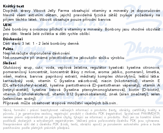 Doplněk stravy Vibovit Jelly Farma obsahující vitamíny a minerály je doporučován hlavně všem aktivním dětem, jejichž pravidelná fyzická zátěž zvyšuje požadavky na příjem těchto látek. Vibovit obsahuje pouze přírodní barviva.