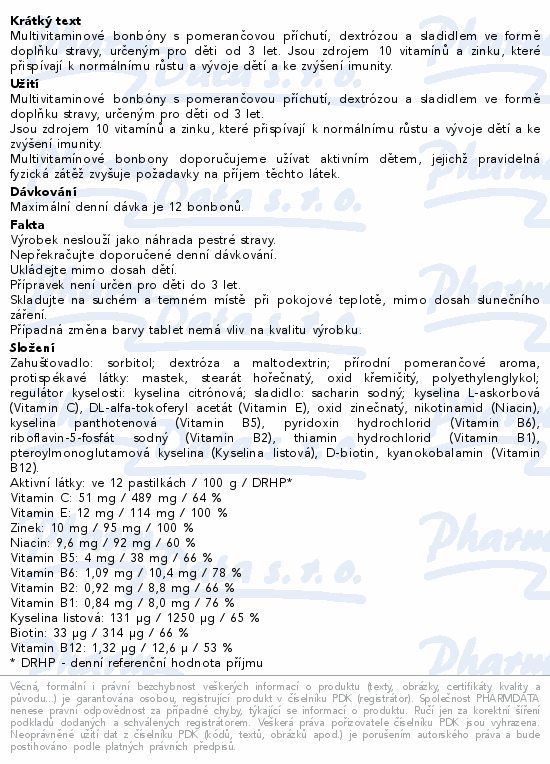 Multivitaminové bonbóny s pomerančovou příchutí, dextrózou a sladidlem ve formě doplňku stravy, určeným pro děti od 3 let. Jsou zdrojem 10 vitamínů a zinku, které přispívají k normálnímu růstu a vývoje dětí a ke zvýšení imunity.