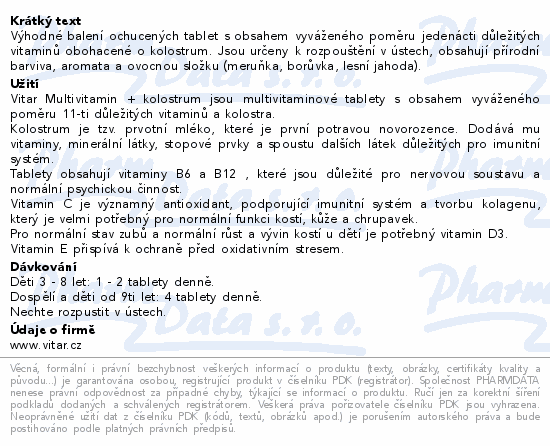 Výhodné balení ochucených tablet s obsahem vyváženého poměru jedenácti důležitých vitaminů obohacené o kolostrum. Jsou určeny k rozpouštění v ústech, obsahují přírodní barviva, aromata a ovocnou složku (meruňka, borůvka, lesní jahoda).