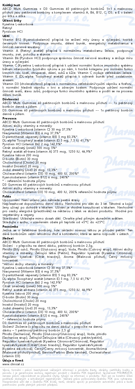 ABCD Multi Gummies + D3 Gummies 60 pektinových bonbónů 1+1 s malinovou příchutí jsou pektinové bonbóny s komplexem vitamínů A, B6, B12, C, D3, a E v balení po 60ks + 60ks.