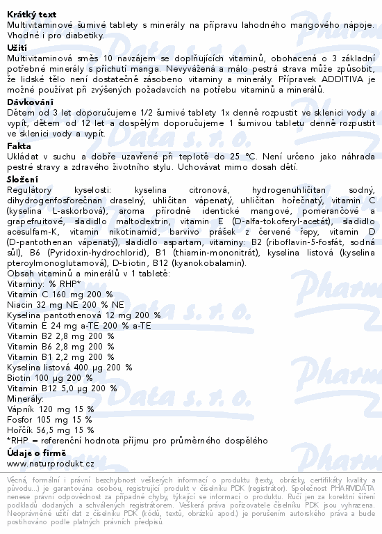 Multivitaminové šumivé tablety s minerály na přípravu lahodného mangového nápoje. Vhodné i pro diabetiky.