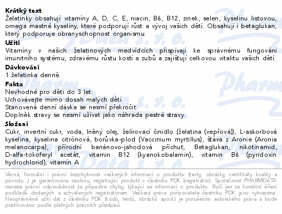 Želatinky obsahují vitamíny A, D, C, E, niacin, B6, B12, zinek, selen, kyselinu listovou, omega mastné kyseliny, které podporují růst a vývoj vašich dětí. Obsahují i betaglukan, který podporuje obranyschopnost organismu.