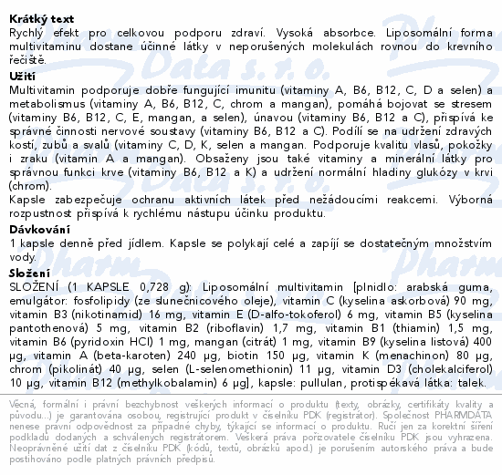 Rychlý efekt pro celkovou podporu zdraví. Vysoká absorbce. Liposomální forma multivitaminu dostane účinné látky v neporušených molekulách rovnou do krevního řečiště.