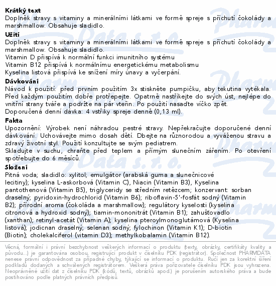 Doplněk stravy s vitaminy a minerálními látkami ve formě spreje s příchutí maliny. Obsahuje sladidlo.