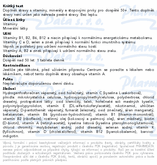 Doplněk stravy s vitamíny, minerály a stopovými prvky pro dospělé 50+. Tento doplněk stravy není určen jako náhrada pestré stravy. Bez lepku.