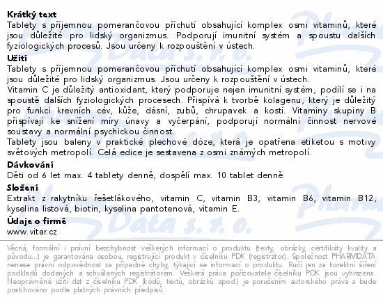 Tablety s příjemnou pomerančovou příchutí obsahující komplex osmi vitaminů, které jsou důležité pro lidský organizmus. Podporují imunitní systém a spoustu dalších fyziologických procesů. Jsou určeny k rozpouštění v ústech.