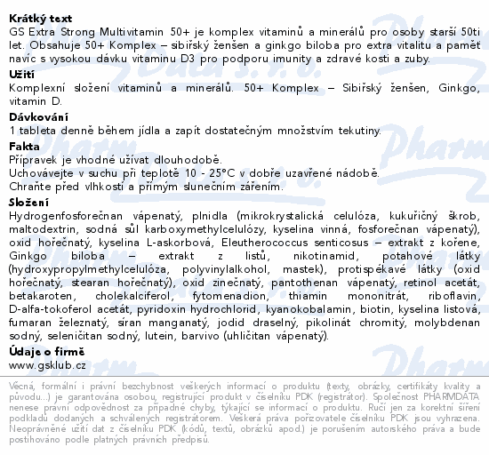 GS Extra Strong Multivitamin 50+ je komplex vitaminů a minerálů pro osoby starší 50ti let. Obsahuje 50+ Komplex – sibiřský ženšen a ginkgo biloba pro extra vitalitu a paměť navíc s vysokou dávku vitaminu D3 pro podporu imunity a zdravé kosti a zuby.