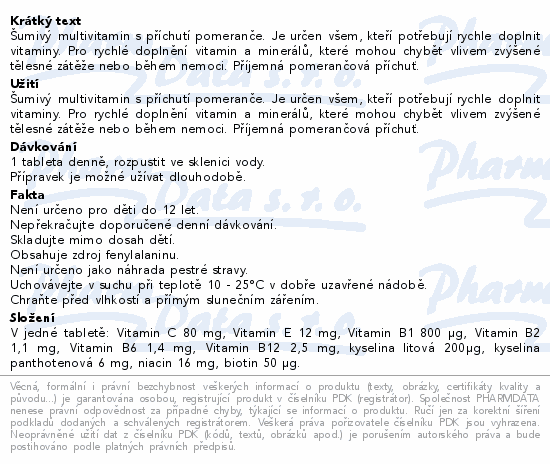 Šumivý multivitamin s příchutí pomeranče. Je určen všem, kteří potřebují rychle doplnit vitaminy. Pro rychlé doplnění vitamin a minerálů, které mohou chybět vlivem zvýšené tělesné zátěže nebo během nemoci. Příjemná pomerančová příchuť.