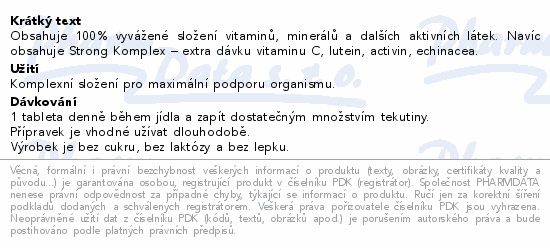 Obsahuje 100% vyvážené složení vitaminů, minerálů a dalších aktivních látek. Navíc obsahuje Strong Komplex – extra dávku vitaminu C, lutein, activin, echinacea.