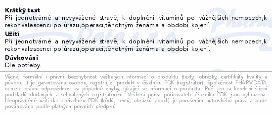 Při jednotvárné a nevyvážené stravě, k doplnění vitamínů po vážnějších nemocech,k rekonvalescenci po úrazu,operaci,těhotným ženáma a období kojení.