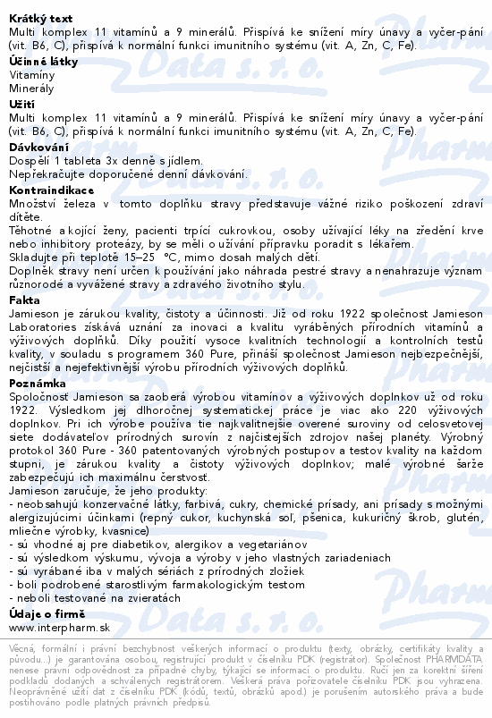 Multi komplex 11 vitamínů a 9 minerálů. Přispívá ke snížení míry únavy a vyčerpání (vit. B6, C), přispívá k normální funkci imunitního systému (vit. A, Zn, C, Fe).
