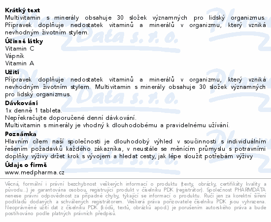 Multivitamin s minerály obsahuje 30 složek významných pro lidský organizmus. Přípravek doplňuje nedostatek vitaminů a minerálů v organizmu, který vzniká nevhodným životním stylem.