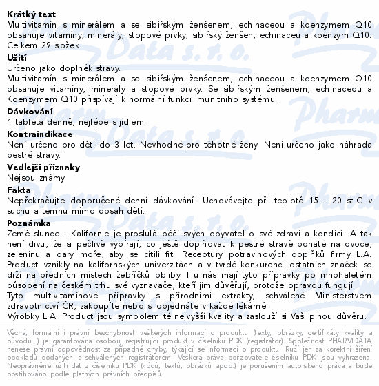 Multivitamín s minerálem a se sibiřským ženšenem, echinaceou a koenzymem Q10 obsahuje vitamíny, minerály, stopové prvky, sibiřský ženšen, echinaceu a koenzym Q10. Celkem 29 složek.