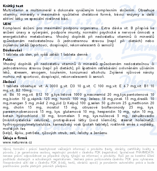 Multivitamin a multiminerál s dokonale vyváženým komplexním složením. Obsahuje vitamíny, minerály v maximálně využitelné chelátové formě, trávicí enzymy a další aktivní látky ve speciální rostlinné bázi.