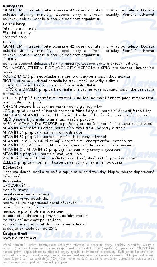 QUANTUM Imunita+ Forte obsahuje 42 složek od vitamínu A až po železo. Dodává důležité vitamíny, minerály, stopové prvky a přírodní extrakty. Pomáhá udržovat celkovou dobrou kondici a posiluje odolnost organismu.