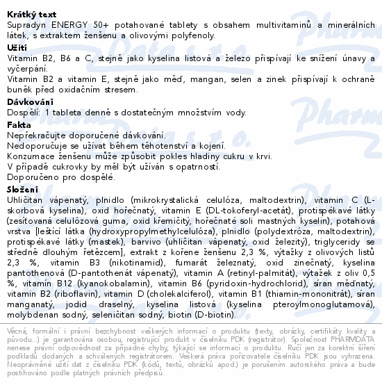 Supradyn ENERGY 50+ potahované tablety s obsahem multivitaminů a minerálních látek, s extraktem ženšenu a olivovými polyfenoly.