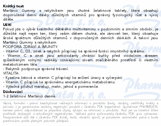 Marťánci Gummy s rakytníkem jsou chutné želatinové tablety, které obsahují doporučené denní dávky důležitých vitamínů pro správný fyziologický růst a vývoj dítěte.