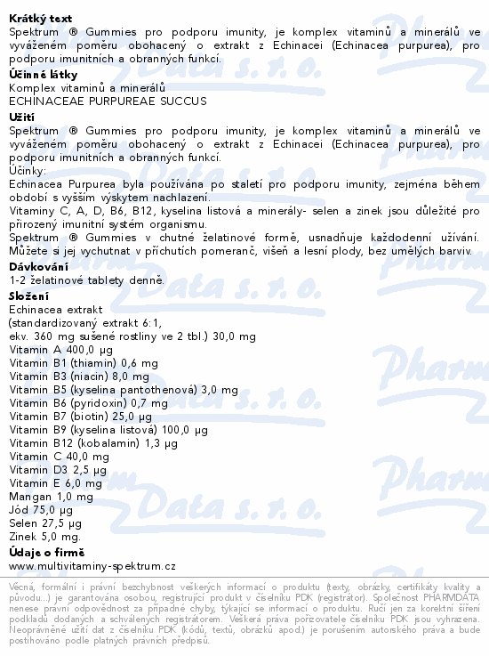 Spektrum ® Gummies pro podporu imunity, je komplex vitaminů a minerálů ve vyváženém poměru obohacený o extrakt z Echinacei (Echinacea purpurea), pro podporu imunitních a obranných funkcí.
