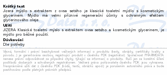 Jizera mýdlo s extraktem z ovsa setého je klasické toaletní mýdlo s kosmetickým glycerinem. Mýdlo má velmi příznivé regenerační účinky s ochranným efektem glycerinového oleje.