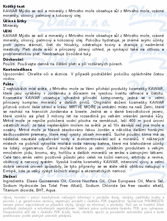 KAWAR Mýdlo se solí a minerály z Mrtvého moře obsahuje sůl z Mrtvého moře, vzácné minerály, olivový, palmový a kokosový olej.
