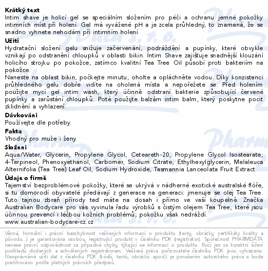 Intim shave je holicí gel se speciálním složením pro péči a ochranu jemné pokožky intimních míst při holení. Gel má vyvážené pH a je zcela průhledný, to znamená, že se snadno vyhnete nehodám při intimním holení.