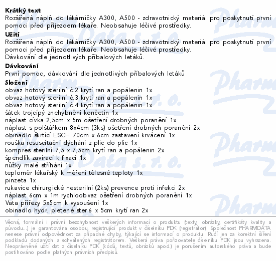 Rozšířená náplň do lékárničky A300, A500 - zdravotnický materiál pro poskytnutí první pomoci před příjezdem lékaře. Neobsahuje léčivé prostředky.