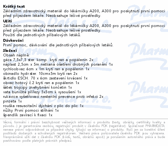 Základním zdravotnický materiál do lékárničky A200, A300 pro poskytnutí první pomoci před příjezdem lékaře. Neobsahuje léčivé prostředky.