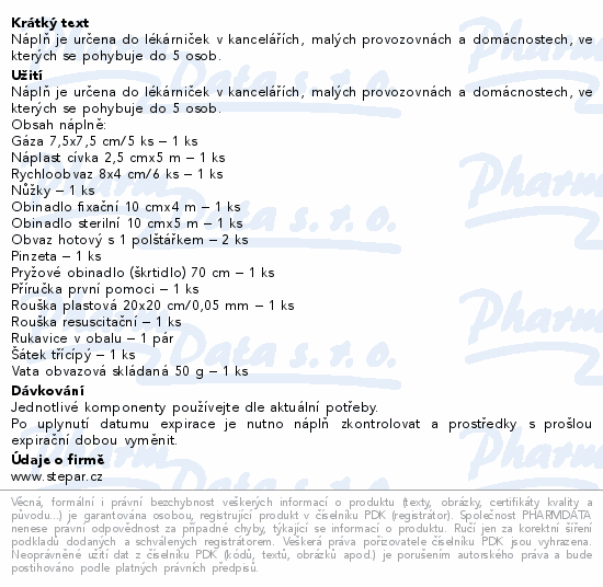 Náplň je určena do lékárniček v kancelářích, malých provozovnách a domácnostech, ve kterých se pohybuje do 5 osob.