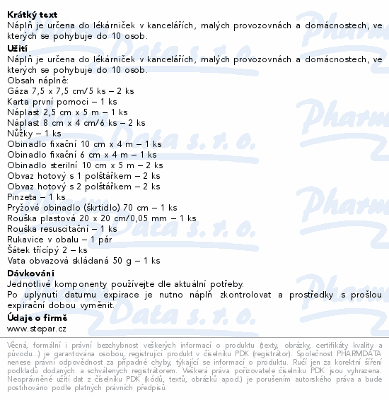 Náplň je určena do lékárniček v kancelářích, malých provozovnách a domácnostech, ve kterých se pohybuje do 10 osob.