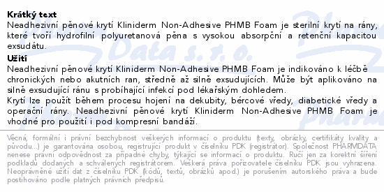 Neadhezivní pěnové krytí Kliniderm Non-Adhesive PHMB Foam je sterilní krytí na rány, které tvoří hydrofilní polyuretanová pěna s vysokou absorpční a retenční kapacitou exsudátu.