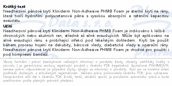 Neadhezivní pěnové krytí Kliniderm Non-Adhesive PHMB Foam je sterilní krytí na rány, které tvoří hydrofilní polyuretanová pěna s vysokou absorpční a retenční kapacitou exsudátu.