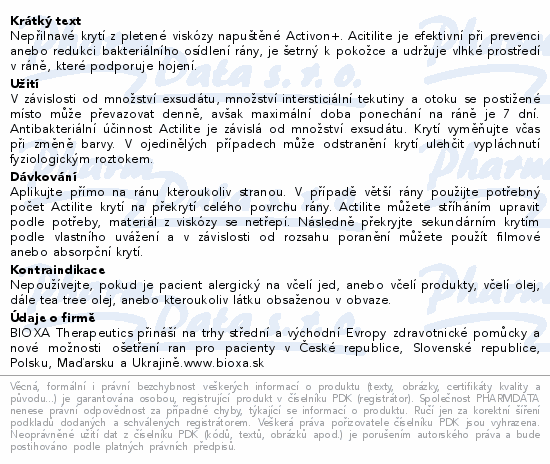 Nepřilnavé krytí z pletené viskózy napuštěné Activon+. Acitilite je efektivní při prevenci anebo redukci bakteriálního osídlení rány, je šetrný k pokožce a udržuje vlhké prostředí v ráně, které podporuje hojení.