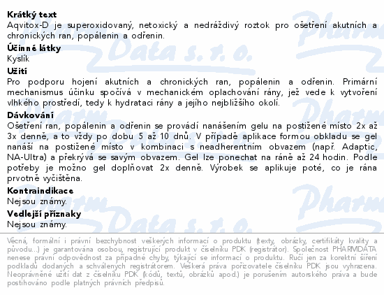 Aqvitox-D je superoxidovaný, netoxický a nedráždivý roztok pro ošetření akutních a chronických ran, popálenin a odřenin.