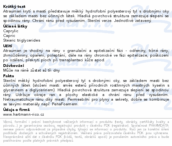 Atrauman krytí s mastí představuje měkký hydrofobní polyesterový tyl s drobnými oky se základem masti bez účinných látek. Hladká povrchová struktura zamezuje slepení se spodinou rány. Chrání ránu před vysušením. Sterilní verze. Jednotlivě zatavený.