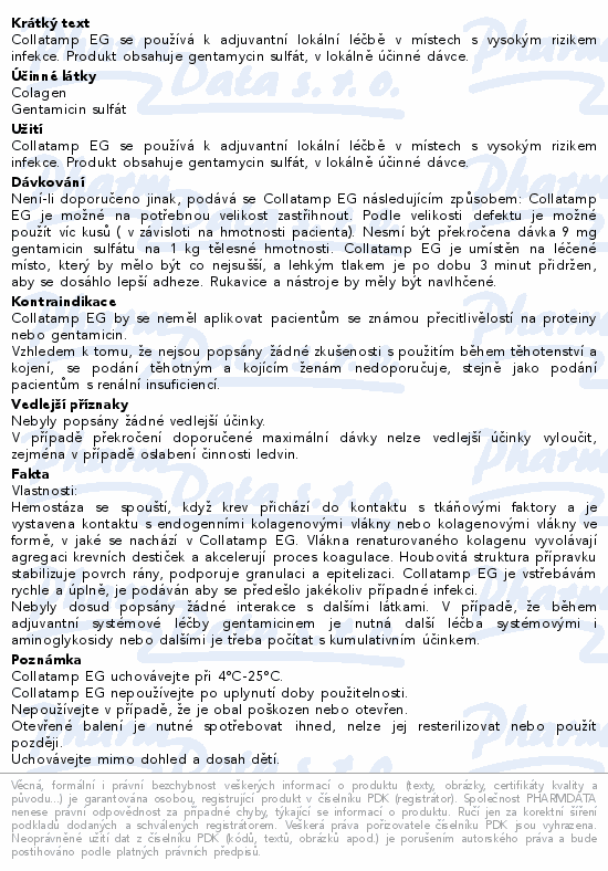 Collatamp EG se používá k adjuvantní lokální léčbě v místech s vysokým rizikem infekce. Produkt obsahuje gentamycin sulfát, v lokálně účinné dávce.
