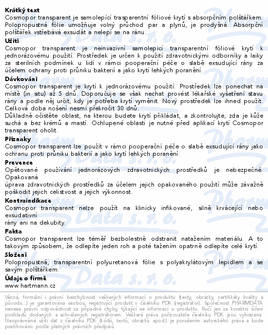 Cosmopor transparent je samolepící trasparentní fóliové krytí s absorpčním polštářkem. Polopropustná fólie umožňuje volný průchod par a plynů, je prodyšná. Absorpční polštářek vstřebává exsudát a nelepí se na ránu.