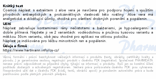 Cosmos náplast s extraktem z aloe vera je navržena pro podporu hojení s využitím přírodních antiseptických a protizánětlivých vlastností této rostliny. Aloe vera má analgetické a zklidňující účinky, vhodná pro ošetření drobných poranění a popálenin.