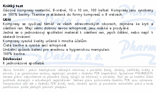 Gázové kompresy nesterilní, 8-vrstvé, 10 x 10 cm, 100 ks/bal. Kompresy jsou vyrobeny ze 100% bavlny. Tkanina je skládaná do formy kompresů o 8 vrstvách.