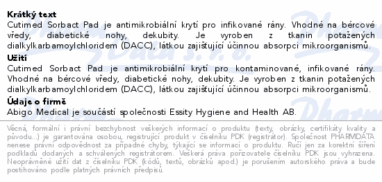 Cutimed Sorbact Pad je antimikrobiální krytí pro infikované rány. Vhodné na bércové vředy, diabetické nohy, dekubity. Je vyroben z tkanin potažených dialkylkarbamoylchloridem (DACC), látkou zajišťující účinnou absorpci mikroorganismů.