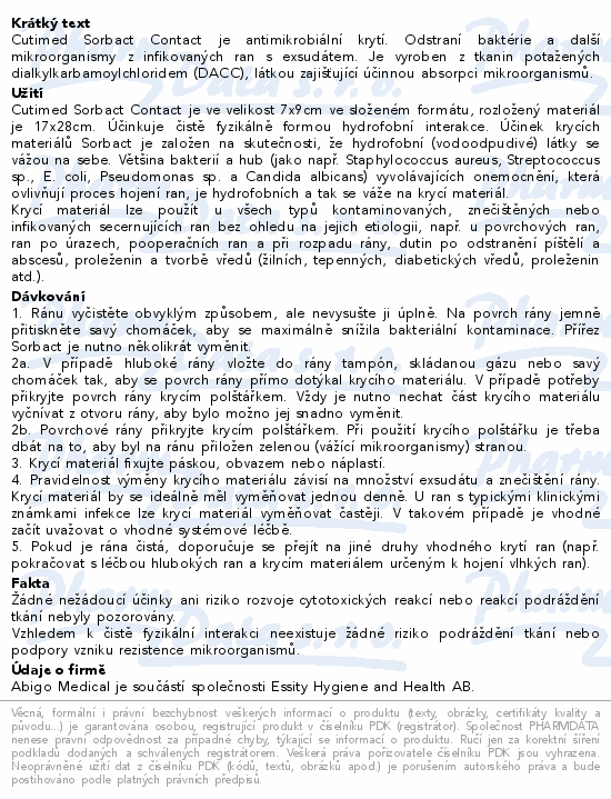 Cutimed Sorbact Contact je antimikrobiální krytí. Odstraní baktérie a další mikroorganismy z infikovaných ran s exsudátem. Je vyroben z tkanin potažených dialkylkarbamoylchloridem (DACC), látkou zajišťující účinnou absorpci mikroorganismů.