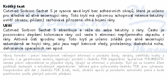 Cutimed Sorbion Sachet S je vysoce savé krytí bez adhezivních okrajů, které je určeno pro středně až silně secernující rány. Toto krytí má výbornou schopnost retence tekutiny uvnitř obvazu, přičemž zachovává přirozené vlhké hojení rány.