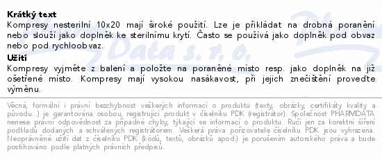 Kompresy nesterilní 10x20 mají široké použití. Lze je přikládat na drobná poranění nebo slouží jako doplněk ke sterilnímu krytí. Často se používá jako doplněk pod obvaz nebo pod rychloobvaz.