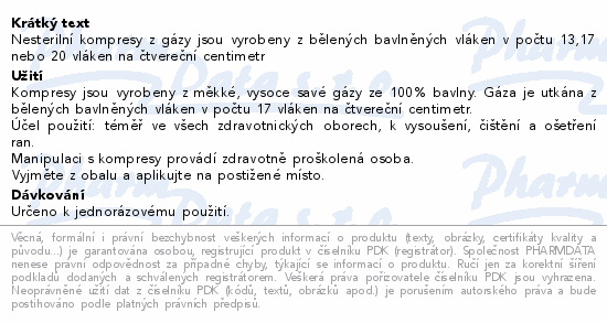 Nesterilní kompresy z gázy jsou vyrobeny z bělených bavlněných vláken v počtu 13,17 nebo 20 vláken na čtvereční centimetr