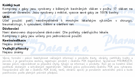 Kompresy z gázy jsou vyrobeny z bělených bavlněných vláken v počtu 17 vláken na centimetr čtvereční. Jsou vyrobeny z měkké, vysoce savé gázy ze 100% bavlny.