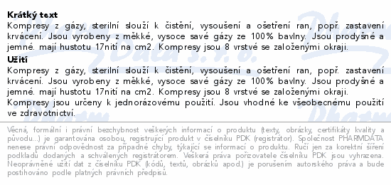 Kompresy z gázy, sterilní slouží k čistění, vysoušení a ošetření ran, popř. zastavení krvácení. Jsou vyrobeny z měkké, vysoce savé gázy ze 100% bavlny. Jsou prodyšné a jemné. mají hustotu 17nití na cm2. Kompresy jsou 8 vrstvé se založenými okraji.